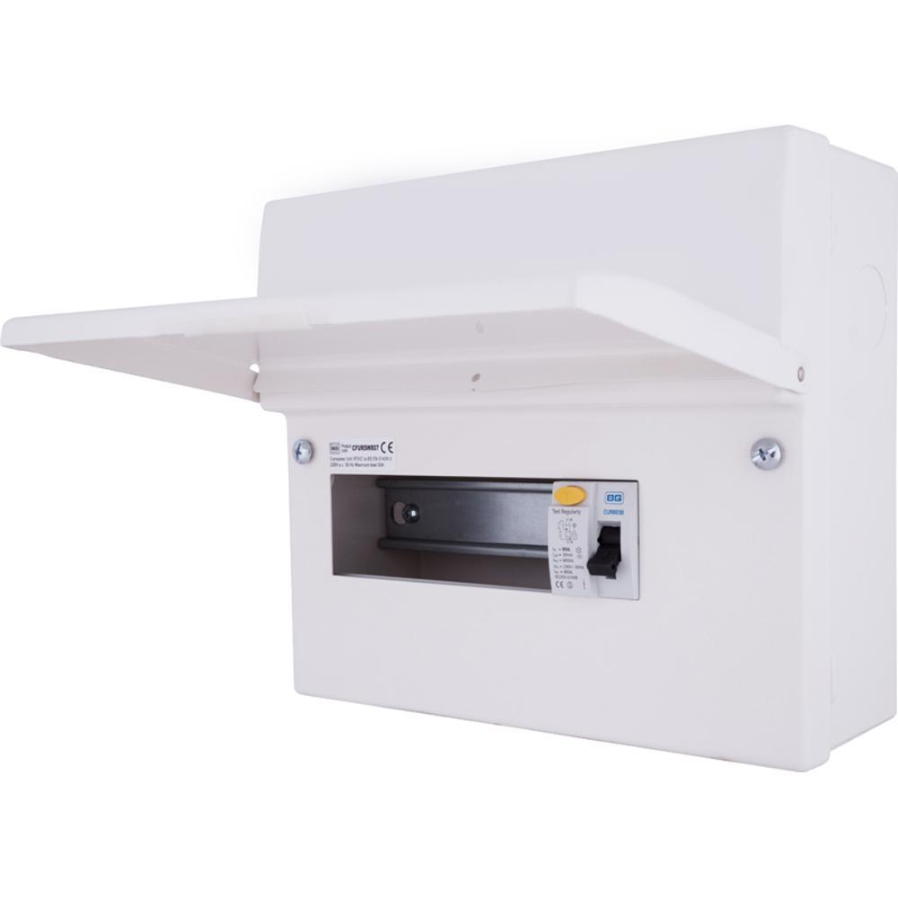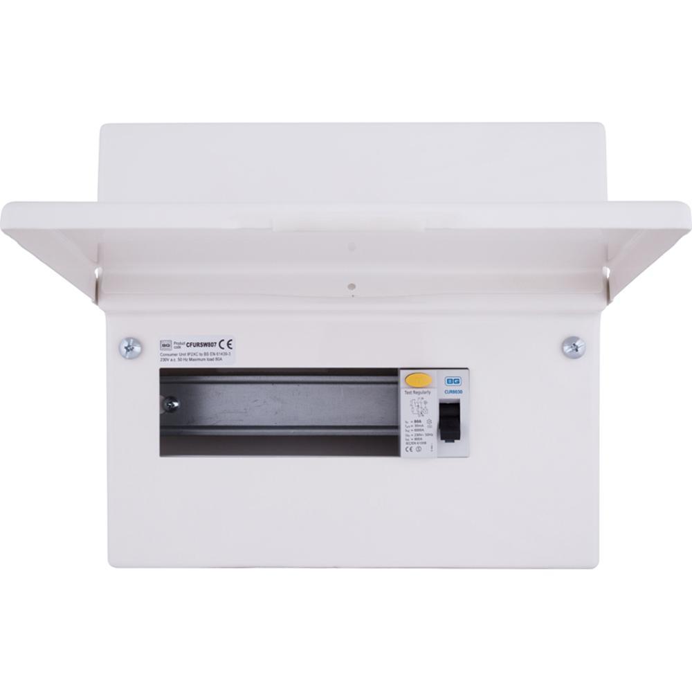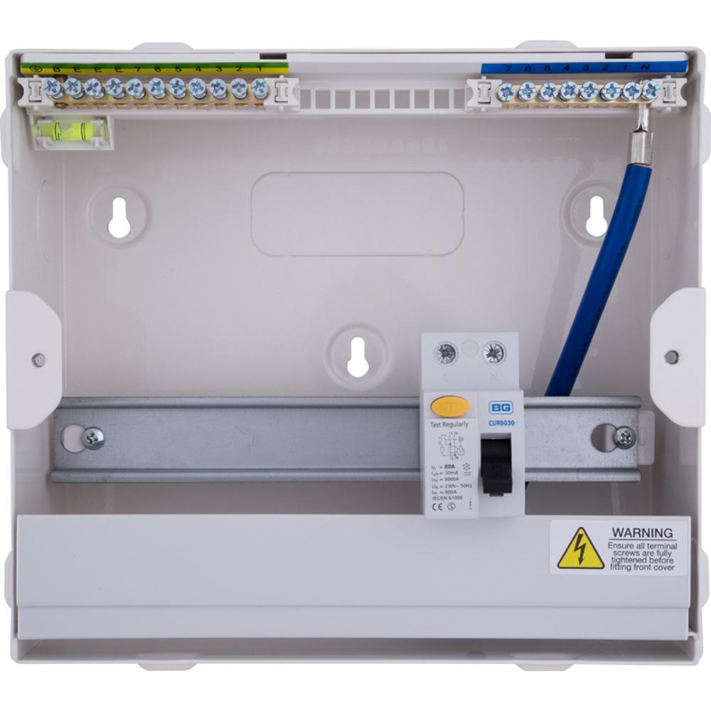 The BG 18th Edition 7 Way Unpopulated Consumer Unit with 80A RCD is part of the Fortress Domestic Circuit Protection range from BG Nexus. The range features a modern stylish design with a sleek profile that matches British General wiring accessories. The integrated spirit level and combi style screws mean you only need one screwdriver when installing, ensuring a quick installation without the need for additional tools.The longer terminal bar provides more capacity and a greater flexibility of number of wiring configurations with better cable retention due to larger screws, enabling greater torque and cables fitted with ferrules. Terminal screws are backed-out and retained preventing loss of screws and saving more time on installation. If you’re using the rear entry knockout on the consumer unit BG supply a trim which protects cables from sharp edged rear entry knockouts. To make first fix faster the distribution board has a fast release DIN rail.