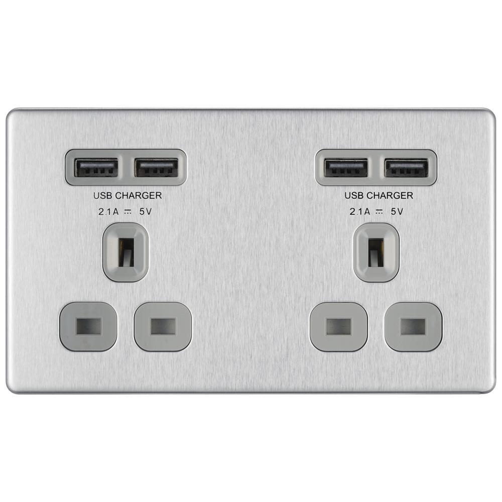 Bg Brushed Steel 13A 2 Gang Unswitched Socket + USB (4 Port 42A) - Grey - Screwless Flatplate