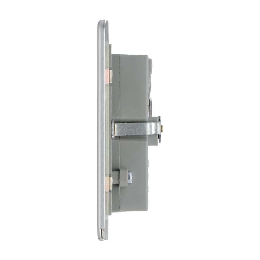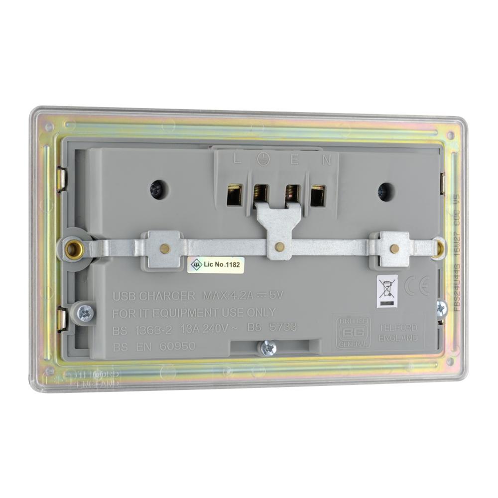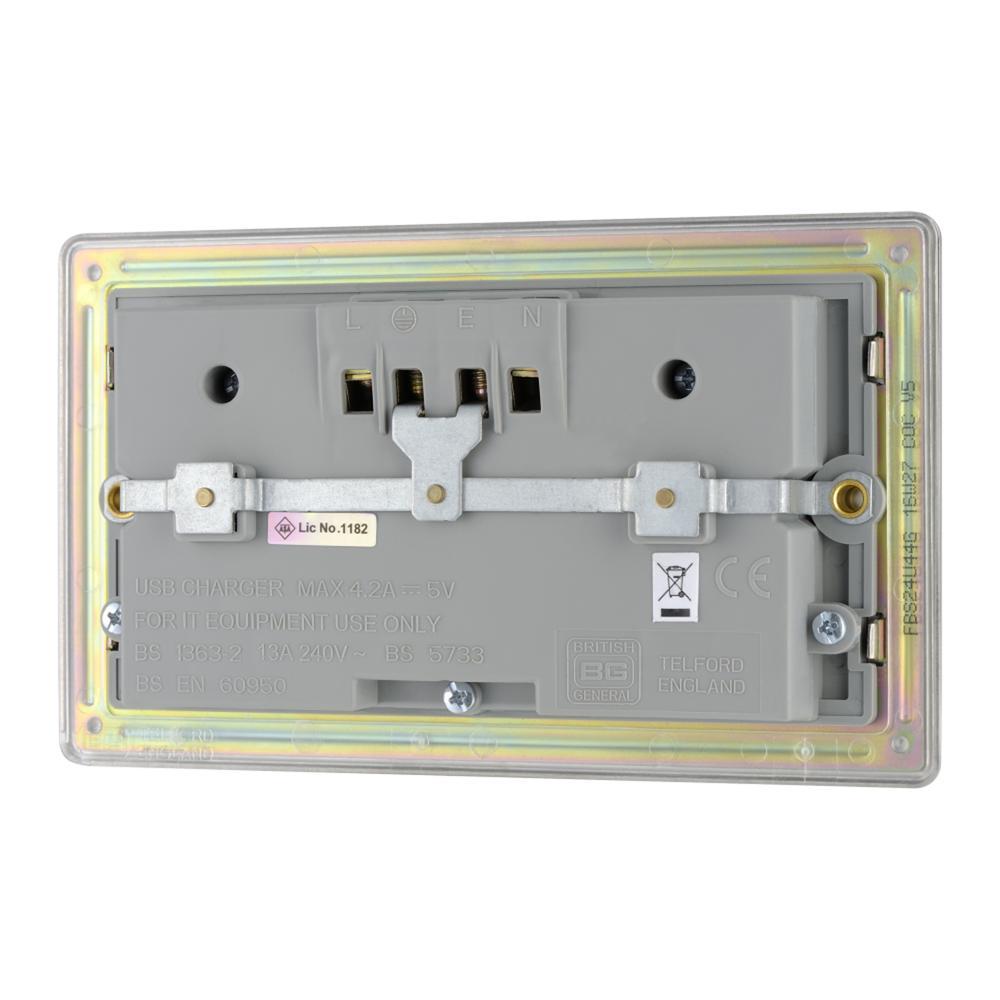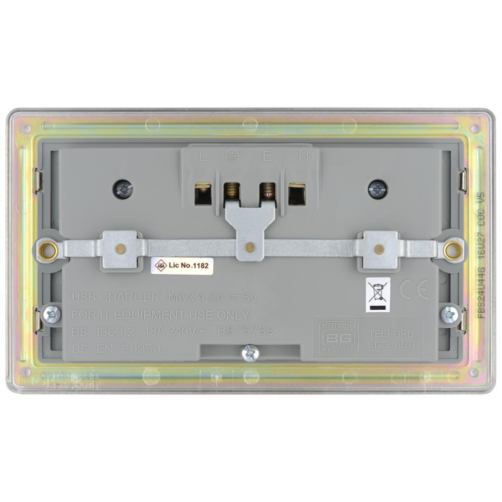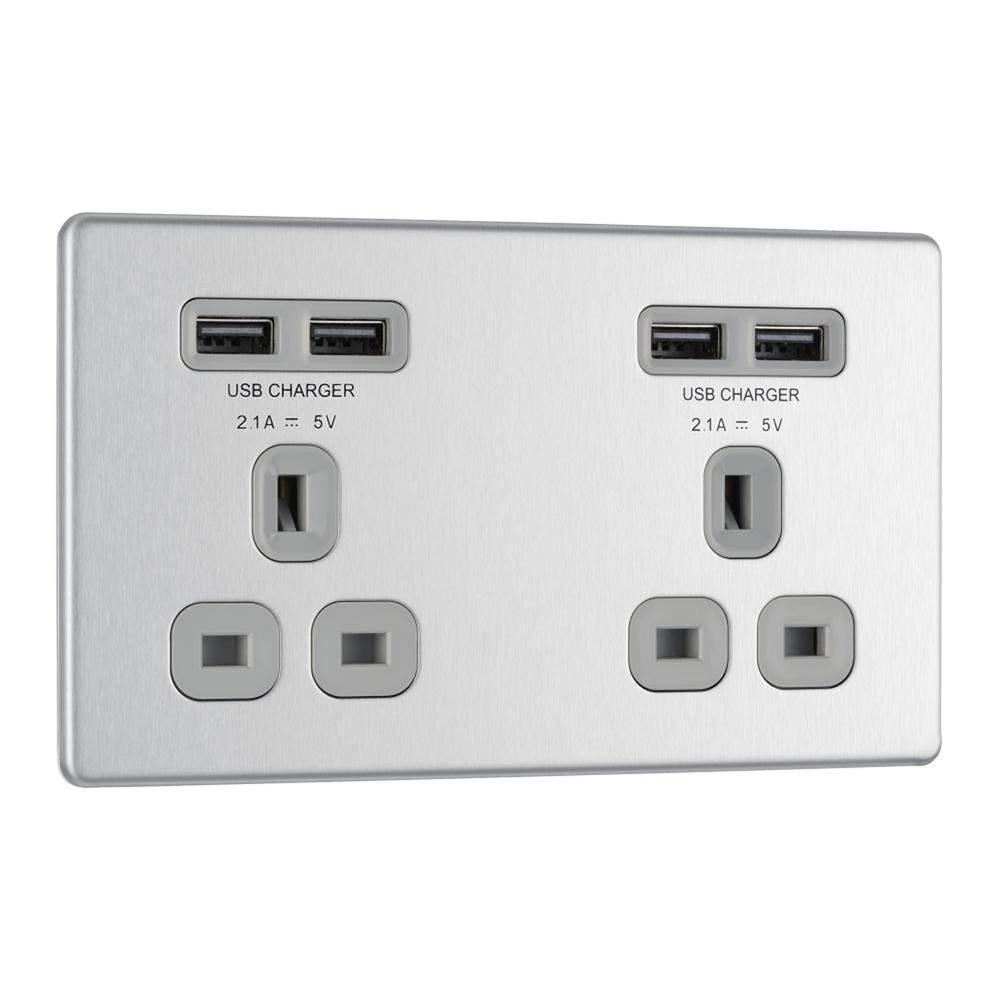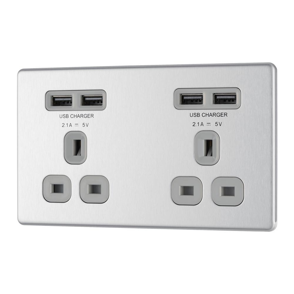 BG FBS24U44G-01 Brushed Steel 13A 2 Gang Unswitched Socket + USB (4 Port 42A) - Grey - Screwless Flatplate.