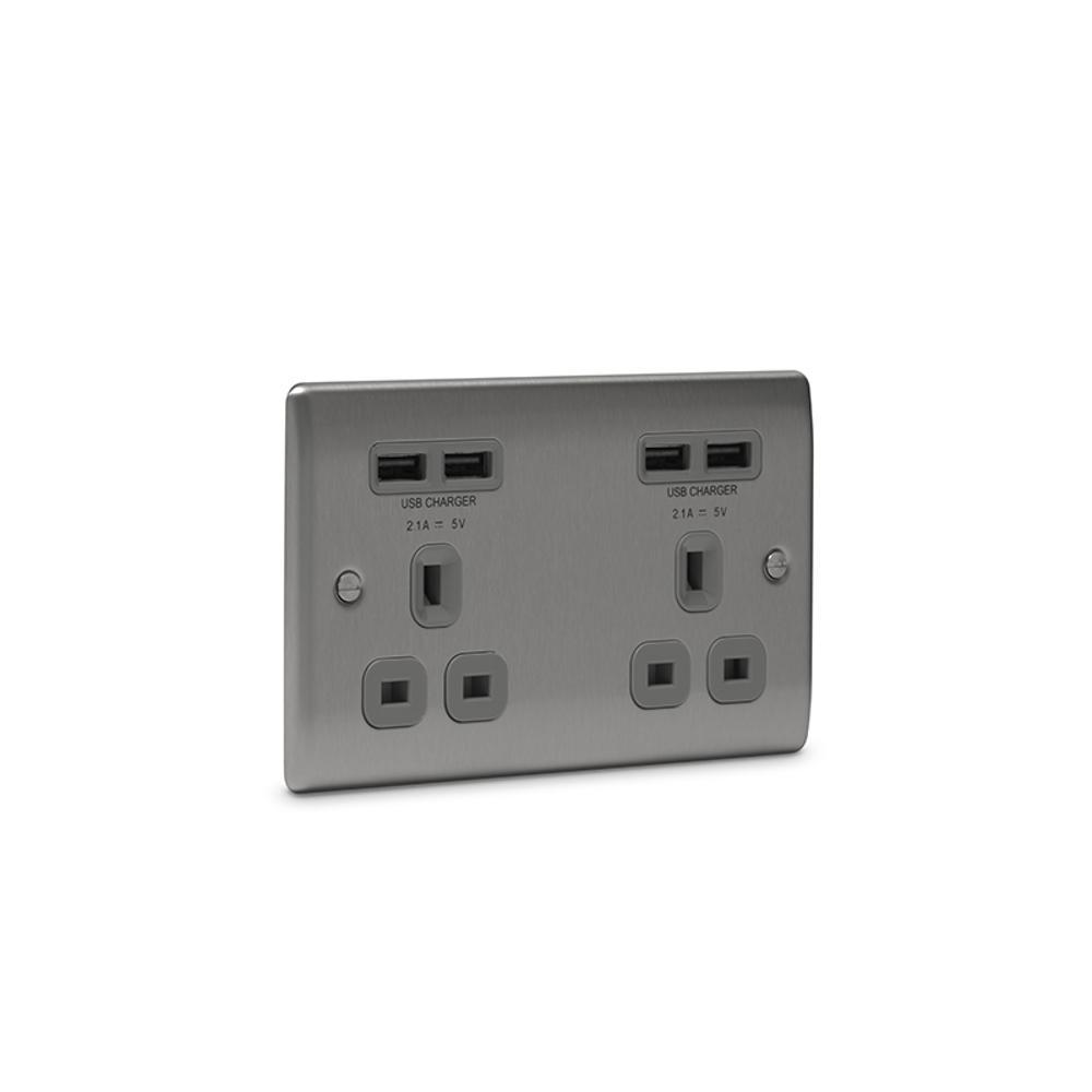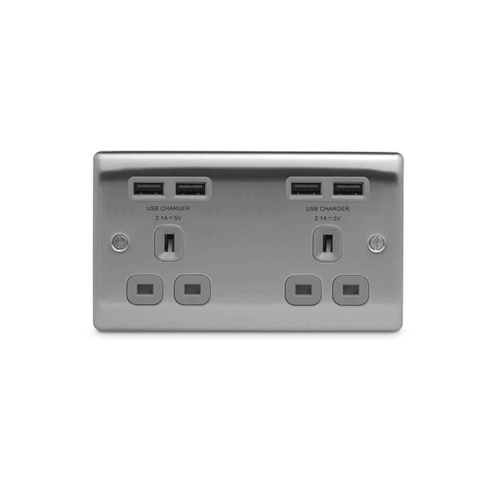 BG Brushed Steel 13A Double Socket + USB (4 Port 4.2A) - NBS24U44G