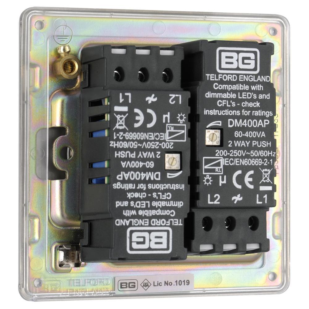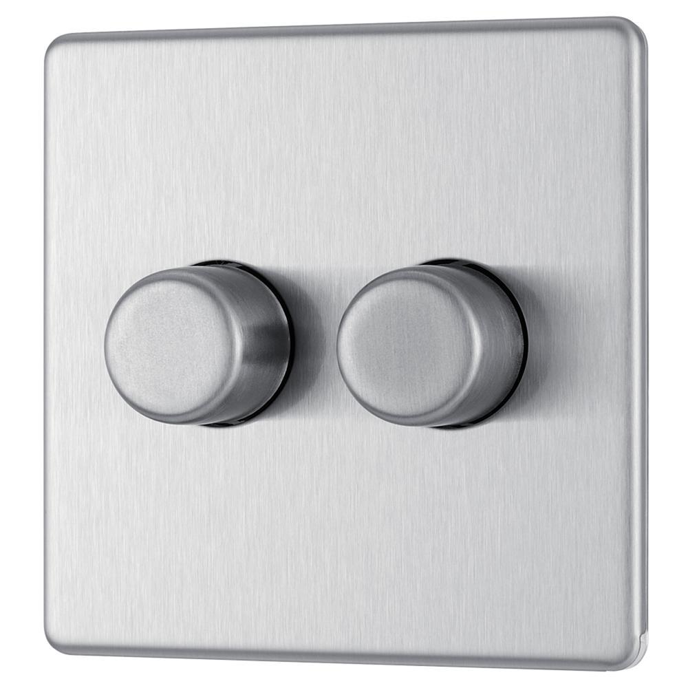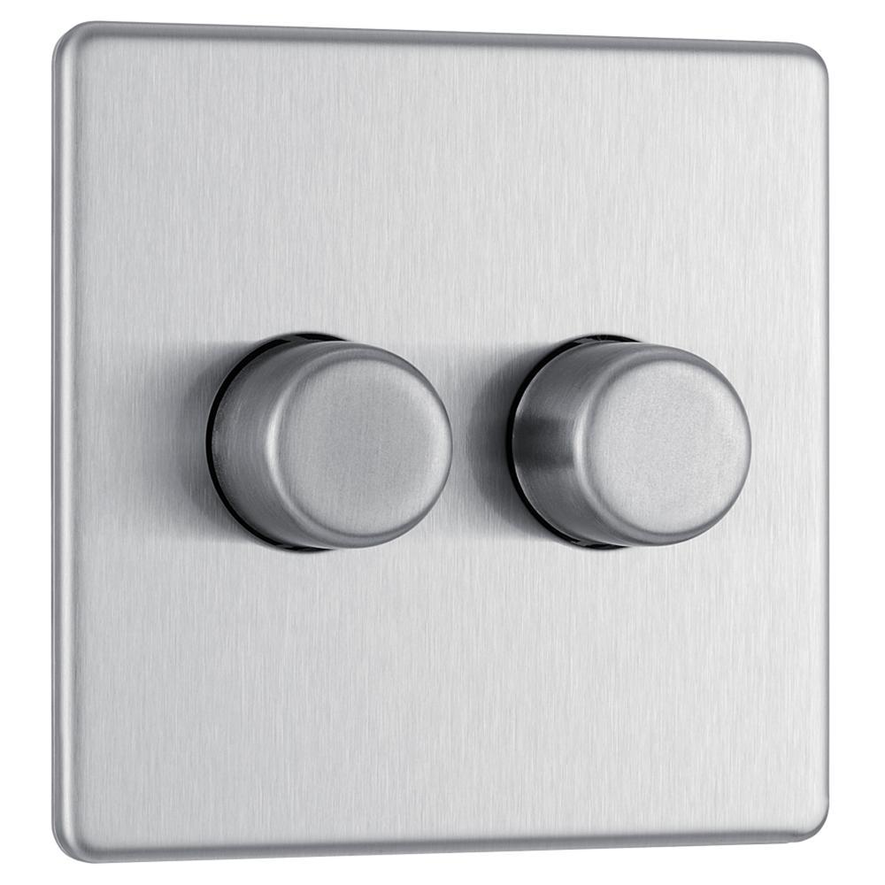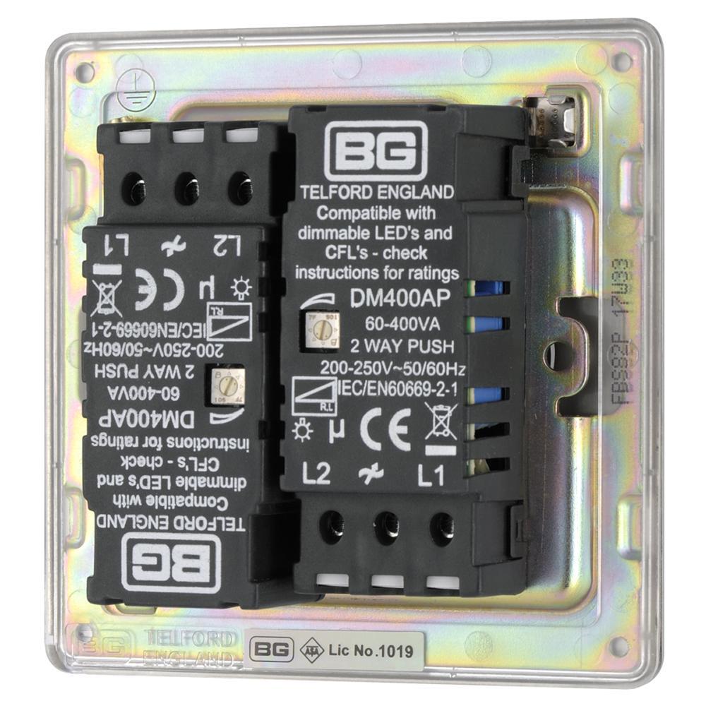 BG FBS82P-01 Brushed Steel 400W 2 Gang 2 Way Push Dimmer - Screwless Flatplate.