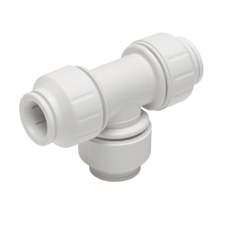 The JG Speedfit plastic push-fit equal tee is used for connecting plastic and copper pipes. Simply push the fitting fully onto the pipe and twist the plastic nut clockwise to lock in place. To demount the connection unlock the nut and push the collet towards the body of the fitting and pull the pipe to release. It ensures an easier working environment in confined places and removes the need for hot works on site. It has been designed, manufactured and assembled in the UK by John Guest Speedfit.